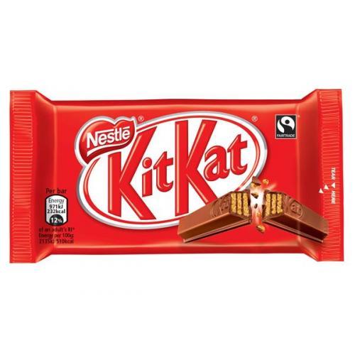 - Kit Kat is a chocolate-coated wafer biscuit bar. Each bar consists of fingers composed of three layers of wafer, covered in an outer layer of chocolate. Each finger can be snapped from the bar separately. Bars typically have 2 or 4 fingers. Larger Kit Kat Chunky bars are also becoming popular now.