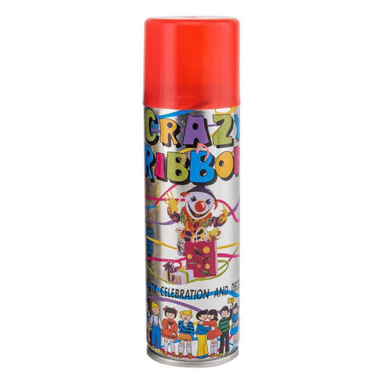Ribbon spray most commonly refers to “crazy ribbon” or party string, an aerosol product that shoots out colorful, continuous strands of foam-like material used for celebrations like birthdays and weddings.